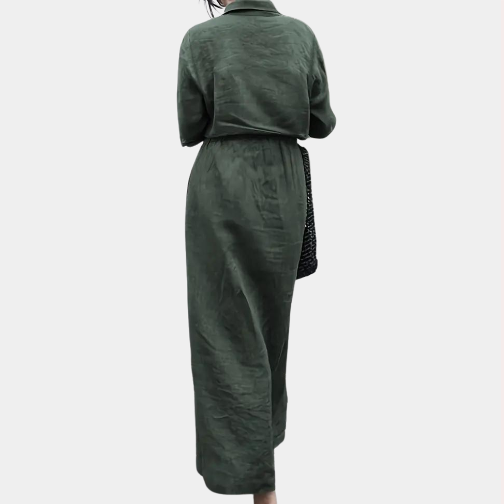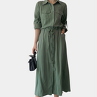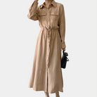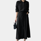De Urban Utility Overhemdjurk is een perfecte mix van functionaliteit en stijl. Met een klassieke overhemdkraag, borstzakken en een verstelbaar taillekoord biedt deze jurk zowel comfort als een flatterend silhouet. De maxi-lengte en lange mouwen maken haar geschikt voor elk seizoen, terwijl de zachte stof soepel valt voor een elegante look. Verkrijgbaar in neutrale en diepe tinten.