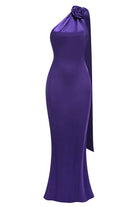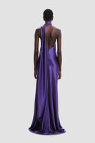 De Viola Gown is een ultiem statement van elegantie en kracht. Deze halterjurk in diep paars satijn omhult het lichaam als een tweede huid en accentueert elke curve. De asymmetrische schouder met gedrapeerde sjaaldetail voegt een dramatisch en sculpturaal element toe. Een open rug en vloeiend silhouet maken deze jurk perfect voor rode loper-momenten of onvergetelijke avondfeesten.