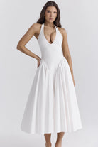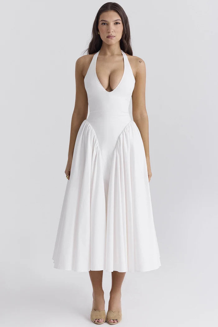 De Vivienne Dress is een verfijnde midi-jurk die klassieke elegantie uitstraalt. Met een diepe V-hals, dunne bandjes en een zwierige A-lijn rok creëert deze jurk een vrouwelijk en luchtig silhouet. De gladde, witte stof geeft de jurk een tijdloze uitstraling, perfect voor zomerse feesten, diners of als moderne bridal look.