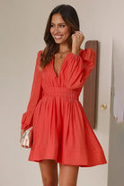 De Vivienne Jurk is een opvallend en speels item dat vrouwelijke elegantie combineert met een dosis flair. Gemaakt van glanzende satijnlook-stof in levendig koraalrood, heeft deze mini-jurk een diepe V-hals, pofmouwen en een subtiel uitlopende rok. De geplooide taille zorgt voor een flatterend silhouet, perfect voor momenten waarop je stijlvol en stralend voor de dag wilt komen.