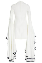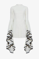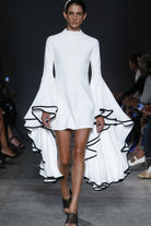 De Volare Jurk is een waar statement van moderne elegantie. Met haar cleane, witte ontwerp en opvallende uitlopende mouwen met contrasterende roesdetails straalt deze jurk een artistieke en verfijnde flair uit. De gestructureerde pasvorm en hoge hals zorgen voor een krachtig silhouet dat moeiteloos de aandacht trekt.