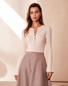 De Wavy Edge Knit Top combineert een tijdloos silhouet met speelse details. De golvende V-halslijn en de licht uitlopende mouwen geven deze aansluitende top een unieke en vrouwelijke uitstraling. Het zachte ribmateriaal zorgt voor een comfortabele pasvorm en maakt het tot een veelzijdig kledingstuk voor elke gelegenheid.